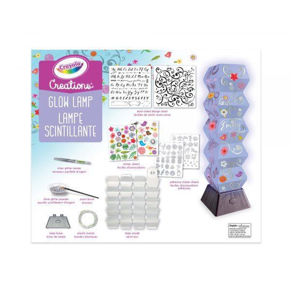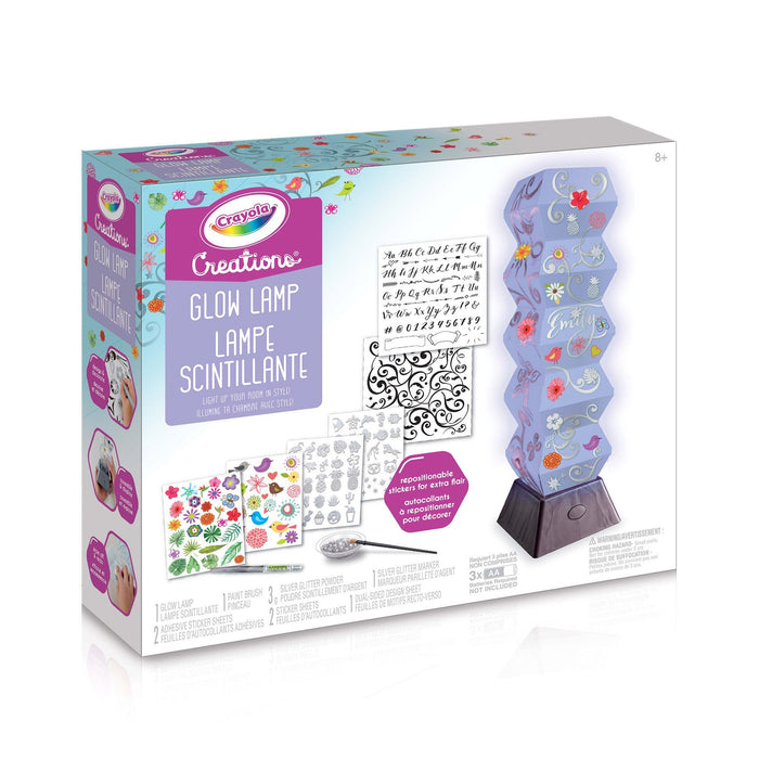 Create just the right mood with the customizable Crayola Creations Glow Lamp. Personalize the lamp shade with stickers, glitter and metallic marker designs to add some shimmery mood lighting to your room! The metallic marker and repositionable stickers can be changed again and again to get just the right look. Includes 1 glow lamp, 1 paint brush, 3 grams of silver glitter powder, 1 silver glitter marker, 4 sticker sheets and 1 dual-sided design sheet.