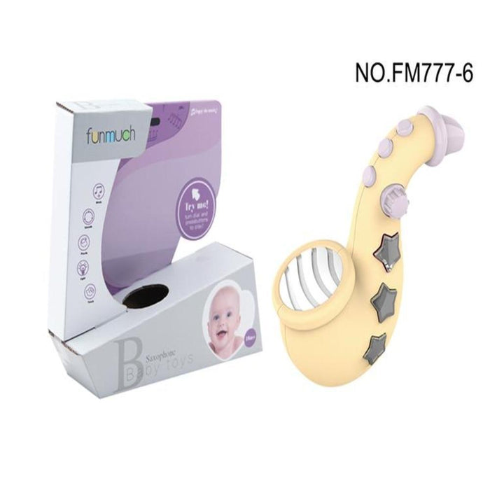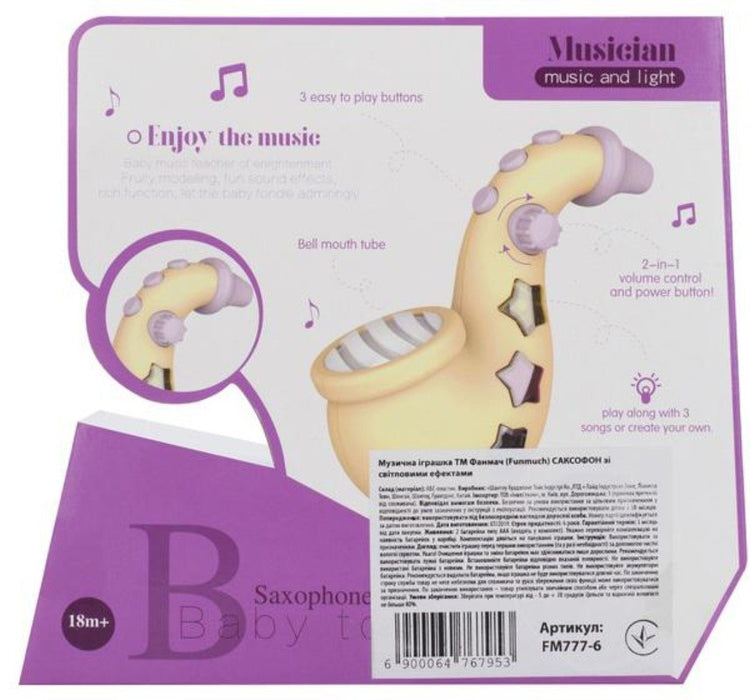 Musical toy with light effects Saxophone Funmunch . Has 6 music buttons that activate light and sound effects. The kid can easily create his own melody by pressing the buttons or recreate 3 standard compositions. Equipped with a volume control.