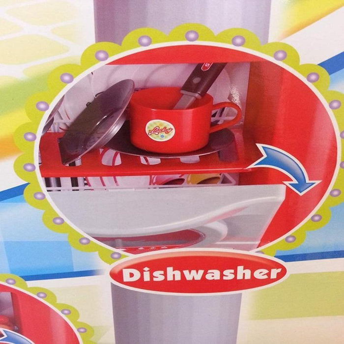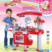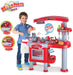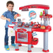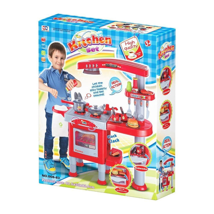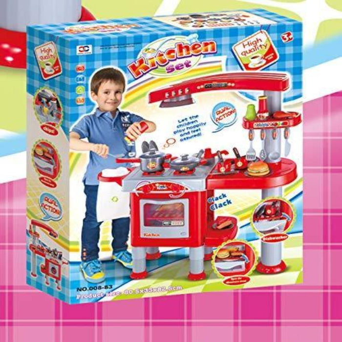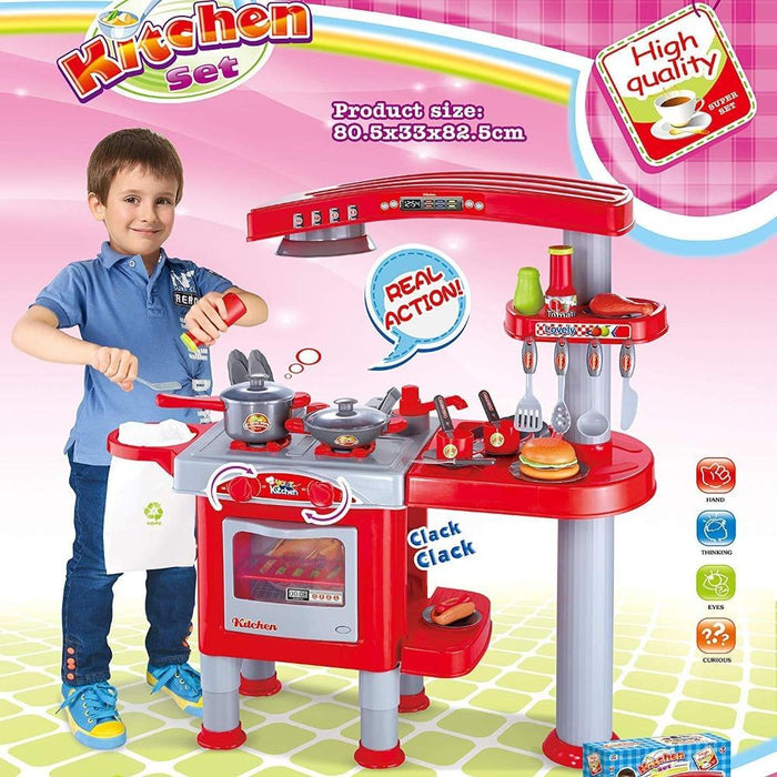 Boy's kitchen play set. Pretend kitchen table set with accessories. Includes electronic style hob,pans,pots,cutlery and play food. No battery is required. Product size: 80.5cm x 33cm x 82.5cm. Recommended age 3+