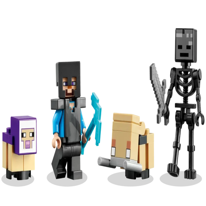 • The set features popular Minecraft™ character Steve plus familiar figures – a baby sheep, baby hoglin and a wither skeleton – and a buildable portal with hand-activated operation.