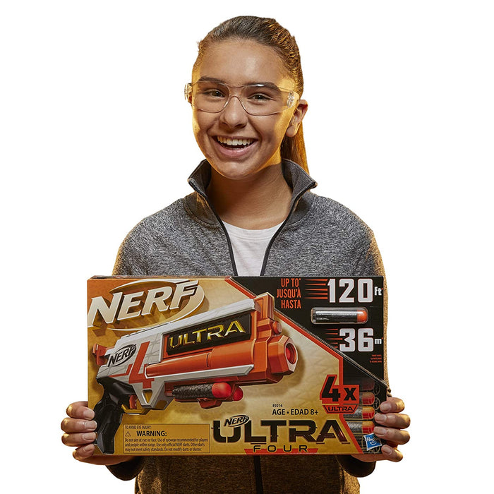 Take on opponents with the power and precision of the single-shot Nerf Ultra Four blaster. Front-load 1 dart into the barrel, pull back the handle to prime the blaster, and press the trigger to fire. It has on-board storage for 2 darts so you can reload fast. Includes 4 Nerf Ultra darts that are compatible only with Nerf Ultra blasters. Send darts flying through the air up to 120 feet (36 meters)! Eyewear recommended (not included).