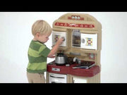 The compact design of this kitchen playset includes all of the realistic kitchen features you’d expect in a pretend play kitchen! Great for junior chefs just learning their pretend play cooking and baking skills, little ones can explore fun features like the working oven and refrigerator doors, pretend to wash the dishes in the molded-in sink with faucet, and more! Entertaining guests? Make a fresh pot of coffee with the molded-in coffee station and coffee pot. Kids can get cooking with the kitchen playset’s stovetop feature, with a fun clickable knob for added sensory play. And although this pretend play kitchen is a smaller model, it’s definitely not short on storage space! Made in USA of US and imported parts.