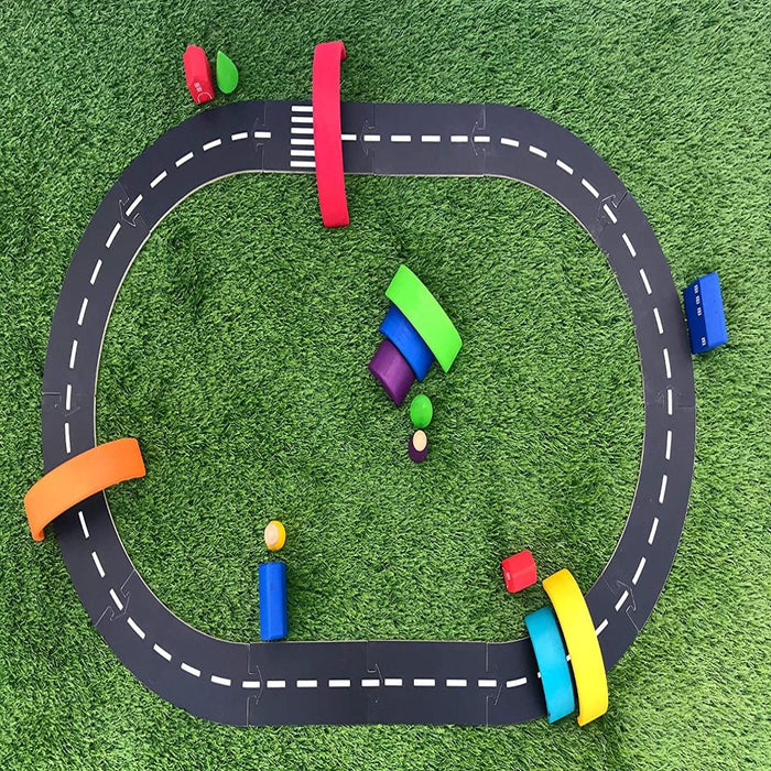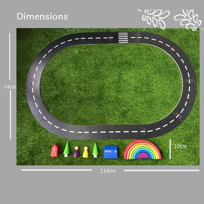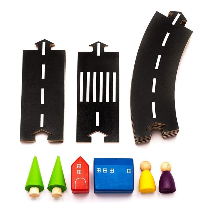 • Build your very own road track and teach your child about road safety and rules. with 18 piece Wooden Road Track Set. The set includes 12 road tracks( 4 straights and 8 curves) and 6 accessories to create beautiful city story.